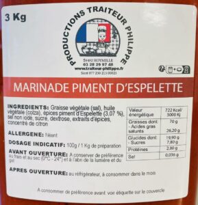 La marinade Piment d’Espelette est une marinade prête à l’emploi. Il vous suffit de badigeonner votre viande ou votre poisson avant de la cuisiner. Nous vous recommandons de la laisser imprégner au minimum 1h au réfrigérateur avant cuisson.